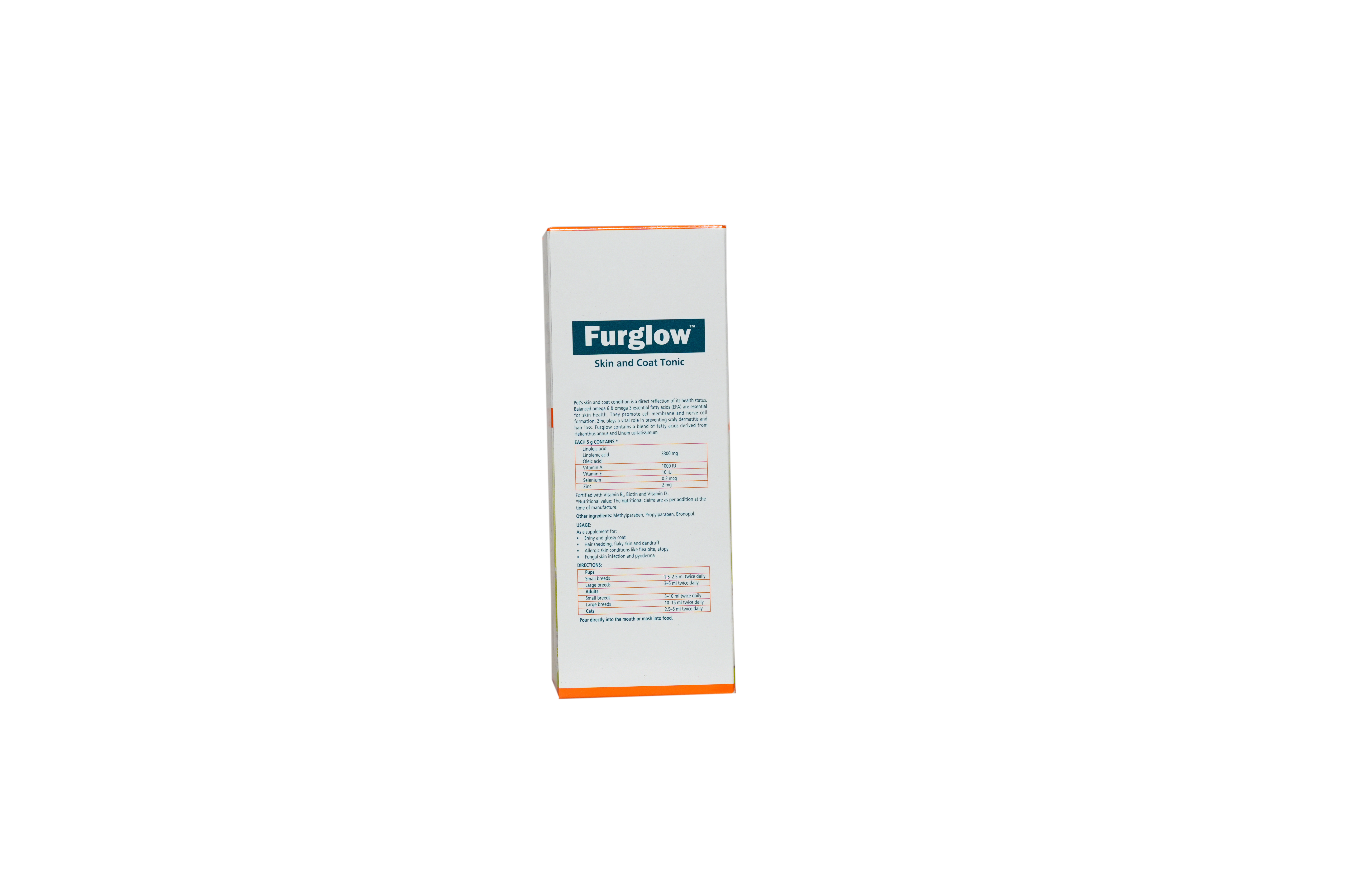 Furglow Skin & Coat Supplement for Dogs & Cats Furglow is a daily skin and coat supplement designed to support healthy, shiny fur in dogs and cats. Formulated with plant-derived Omega 3 & Omega 6 fatty acids, essential minerals, and vitamins, it nourishes the skin from within and helps manage common coat and skin issues. With a balanced Omega 6 : Omega 3 ratio of 10:1, along with Zinc, Selenium, Biotin, and Vitamins A, D, E & B6, Furglow helps reduce hair shedding, flaky skin, and dandruff while promoting a smooth, glossy coat. Key Benefits Supports healthy, shiny skin and coat Helps control hair shedding, dandruff, and flaky skin Balanced Omega 3 & 6 fatty acids for skin nourishment Enriched with Zinc & Selenium for skin health Fortified with Biotin and essential vitamins Suitable for dogs and cats Indications Dull, dry, or rough coat Excessive hair fall and dandruff Allergic skin conditions (flea bites, atopy) Fungal skin infections and pyoderma Suggested Use (or as directed by a veterinarian) Puppies (Small Breeds): 1.5–2.5 ml twice daily Puppies (Large Breeds): 3–5 ml twice daily Adult Dogs (Small Breeds): 5–10 ml twice daily Adult Dogs (Large Breeds): 10–15 ml twice daily Cats: 2.5–5 ml twice daily Disclaimer This is a nutritional supplement. Not intended to replace veterinary treatment. Always consult a veterinarian before use.