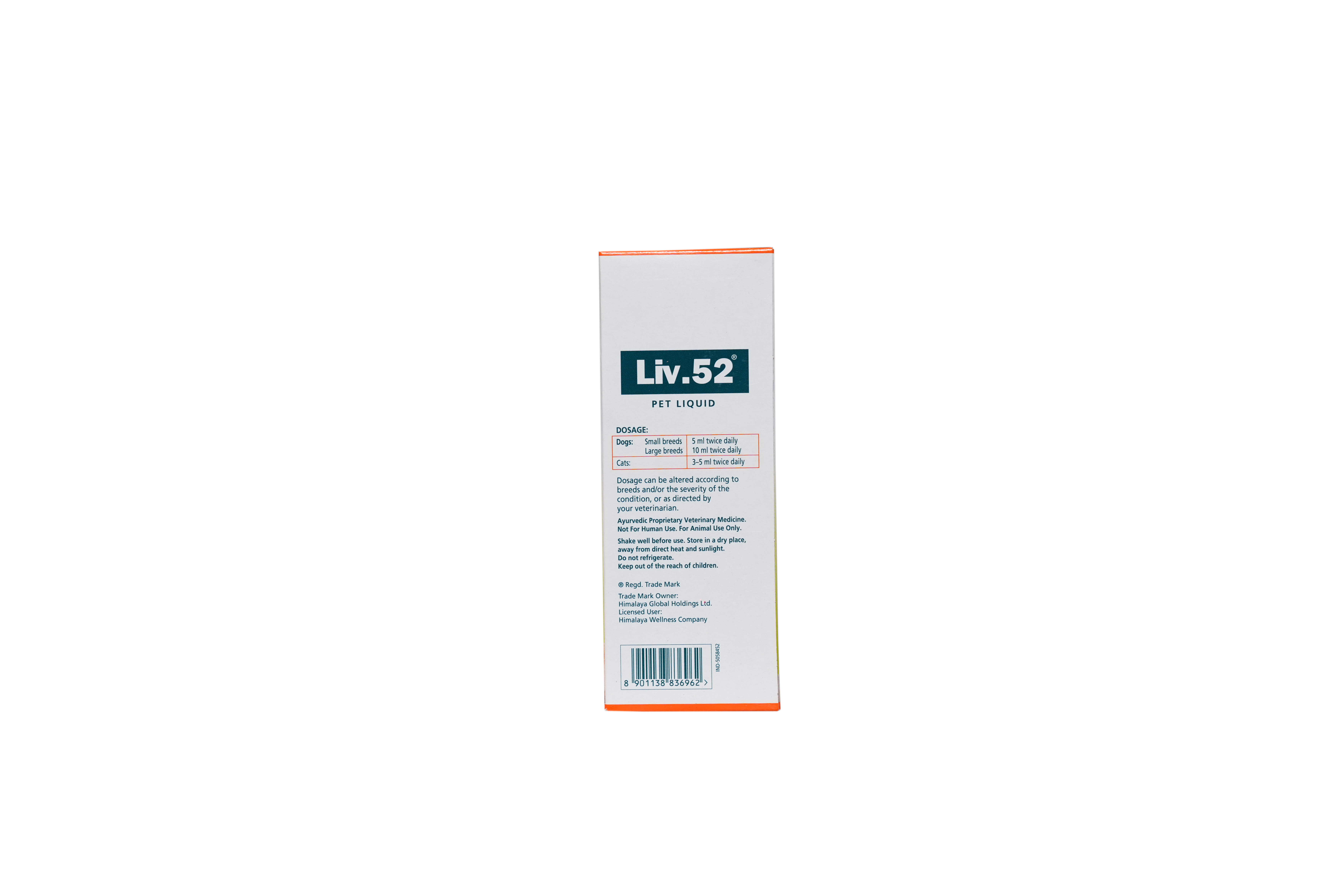 Liv.52 PET Liquid – Liver Support for Dogs & Cats Liv.52 PET Liquid is a herbal liver supplement formulated to support healthy liver function in dogs and cats. Enriched with natural ingredients like Himsra and Kasani, it helps protect the liver from damage caused by toxins, drugs, and infections while supporting appetite, digestion, and overall vitality. It also acts as a growth promoter and metabolic stimulant, making it beneficial for young, stressed, or recovering pets. Key Highlights Liver Protectant Supports repair and regeneration of liver cells and helps maintain healthy liver function. Growth Promoter Helps improve appetite and nutrient utilization, supporting healthy growth. Metabolic Stimulant Enhances metabolic activity and supports digestion and energy levels. Key Benefits Supports liver health in hepatic dysfunction, jaundice, and toxicity Helps manage viral hepatitis, distemper, and parvovirus as supportive care Improves appetite during stress (boarding, relocation, illness) Useful alongside deworming and drug therapy Suitable for dogs and cats Indications Loss of appetite (anorexia) Liver damage and dysfunction Drug- or toxin-induced liver stress Ascites and metabolic imbalance Recommended Dosage (Or as directed by a veterinarian) Small Breed Puppies: 5–8 ml twice daily Large Breed Puppies: 10–15 mltwice daily Kittens: 3–5 ml daily Shake well before use. Store in a cool, dry place away from sunlight. Disclaimer This is a nutritional supplement and should be used under veterinary guidance. Not intended to replace prescribed medication.