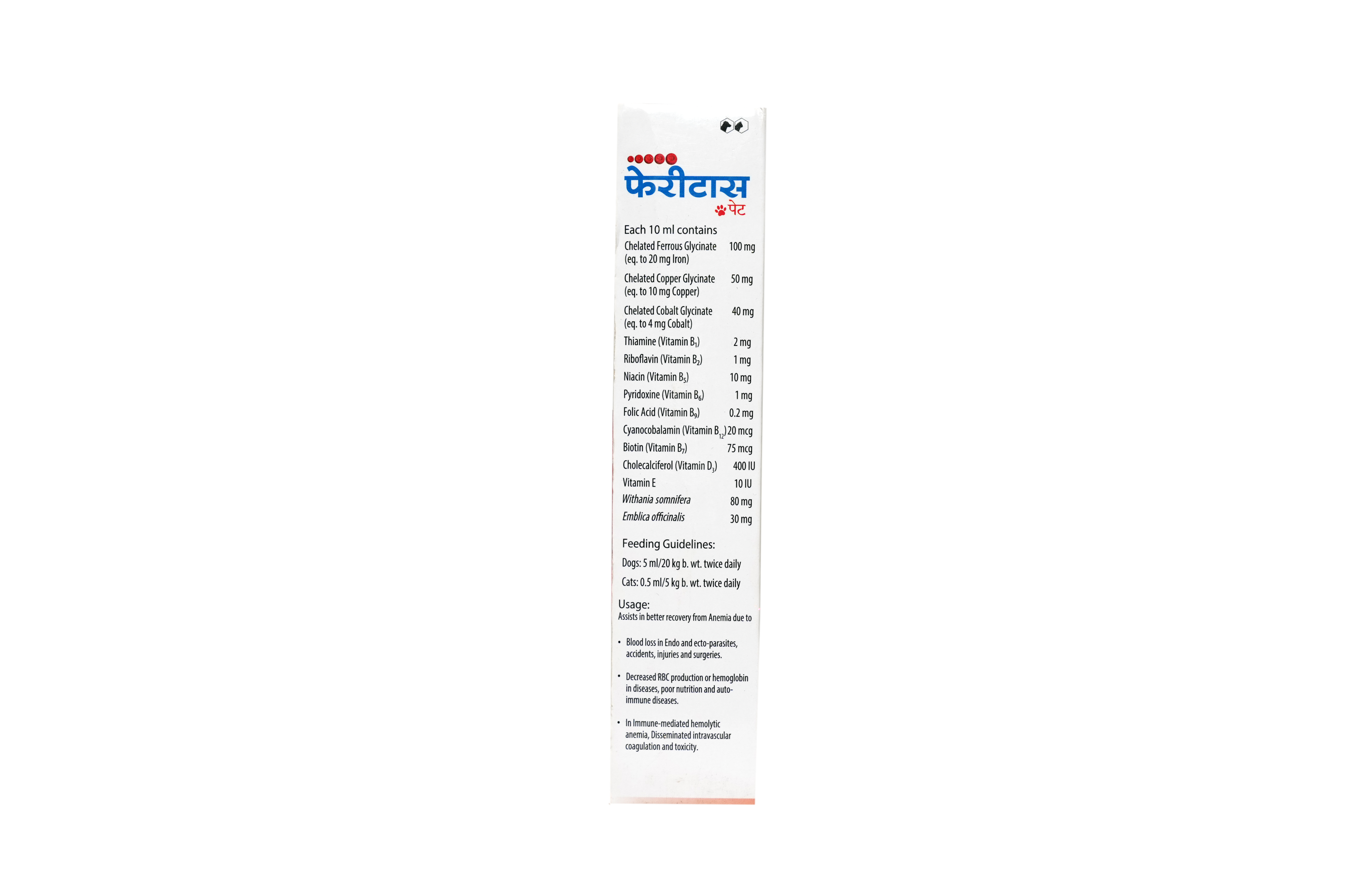 Feritas Syrup for Dogs & Cats Feritas Syrup from Intas Pharmaceuticals is a palatable hematinic supplement designed to support healthy blood formation in dogs and cats. It provides essential nutrients required for red blood cell (RBC) production and helps manage anemia caused by nutritional deficiencies or physiological stress. Composition Iron, Copper, Cobalt, Vitamin B6, Vitamin B12 Class Hematinic Key Benefits & Uses Helps improve hemoglobin levels and overall blood count Supports prevention and management of iron-deficiency anemia Useful during pregnancy, blood loss, parasitic infestations, and recovery Vitamin B12 supports healthy blood cell formation Suitable for dogs and cats of all breeds above 45 days of age Directions for Use Use strictly as advised by a veterinarian. Suitable For Dogs and Cats Disclaimer The information provided is for educational purposes only and is not intended as a substitute for professional veterinary advice. Always consult a qualified veterinarian for diagnosis, dosage, and treatment. AVETMART supports— but does not replace— the veterinarian-pet relationship.