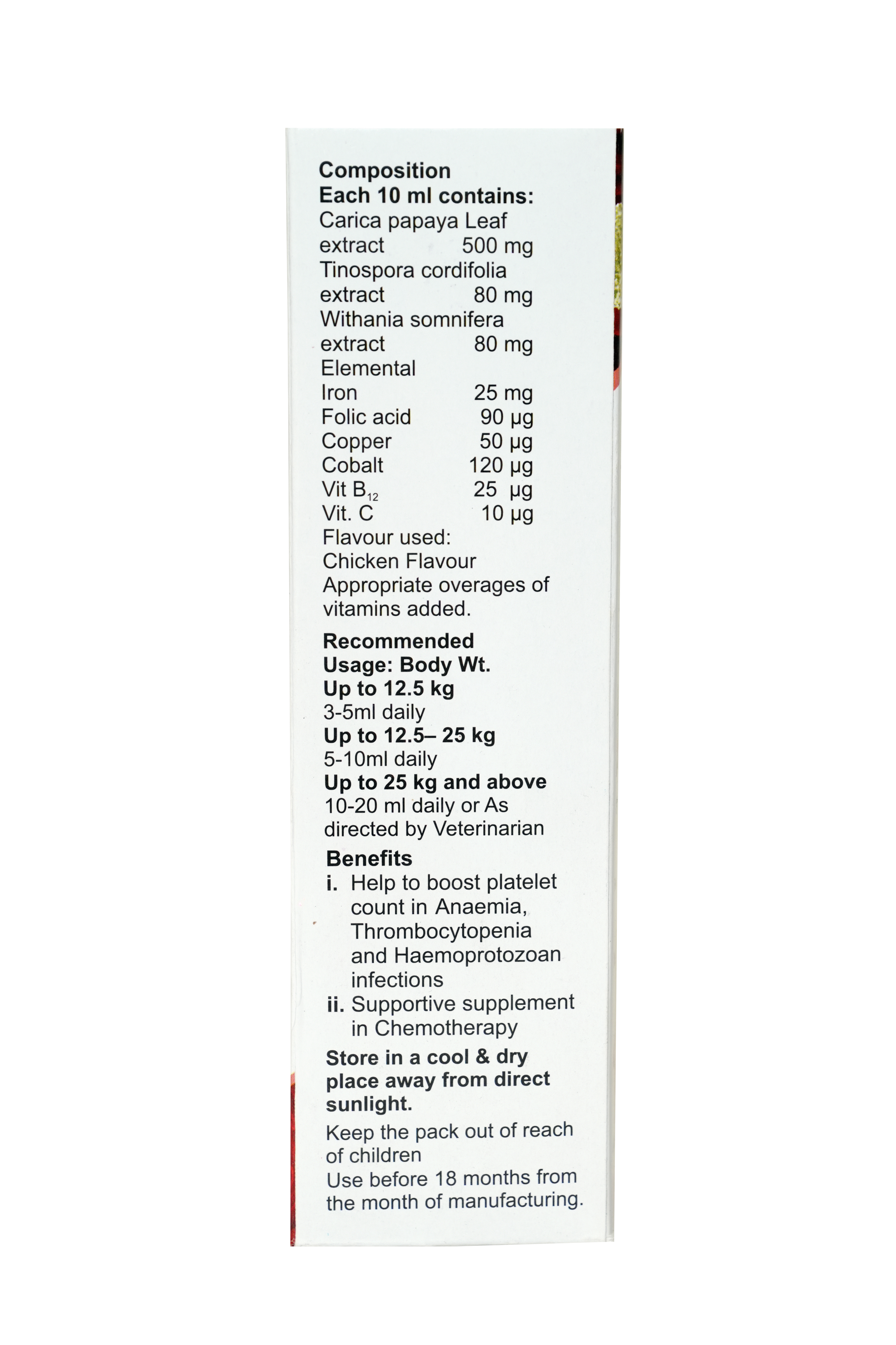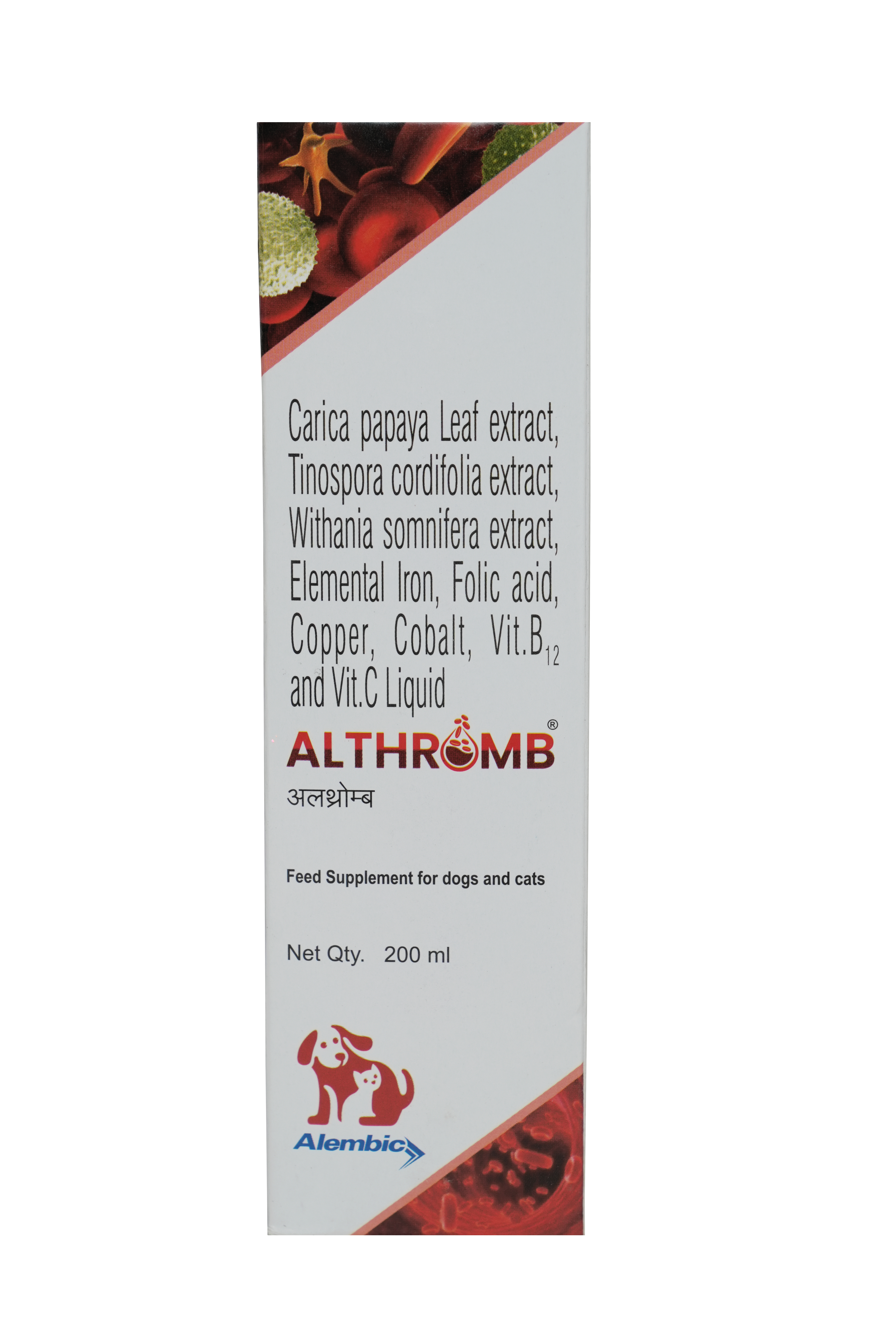 Althromb is a herbal and nutritional supplement designed to help boost platelet count and support blood health. It is commonly used for conditions like anemia, thrombocytopenia (low platelet count), and haemoprotozoan infections. It is also used as a supportive supplement for patients undergoing chemotherapy, as it aids in blood cell regeneration and immune system support. Composition: Carica Papaya Leaf Extract – Helps increase platelet count and supports immune function. Tinospora Cordifolia Extract – An immunomodulator that enhances the body's defense against infections. Withania Somnifera Extract – Also known as Ashwagandha, it helps reduce stress, inflammation, and supports overall health. Elemental Iron – Essential for red blood cell production and preventing anemia. Folic Acid – Aids in red blood cell formation and prevents folate-deficiency anemia. Copper & Cobalt – Important for hemoglobin synthesis and oxygen transport in the blood. Vitamin B12 – Helps prevent anemia and supports nerve health. Vitamin C – Enhances iron absorption and boosts immunity.. Indications/Uses Boosting platelet count in conditions like dengue, viral infections, and thrombocytopenia. Managing anemia due to iron or vitamin deficiencies. Supporting blood health in haemoprotozoan infections (e.g., malaria, babesiosis). As a supportive supplement during chemotherapy to enhance blood cell production and immunity. Improving overall energy levels and immunity Directions for Use Dosage: As prescribed by a healthcare professional. Generally, it is taken once or twice daily. Administration: Can be taken directly or mixed with water/juice. Duration: Continue as advised by a doctor, depending on the condition being treated. Disclaimer: AVETMART provides expert-reviewed and reliable information for informational purposes only. This content is not a substitute for professional veterinary or medical advice. Please consult a qualified veterinarian or healthcare professional before using any product. AVETMART supports, but does not replace, the veterinarian–pet owner relationship.