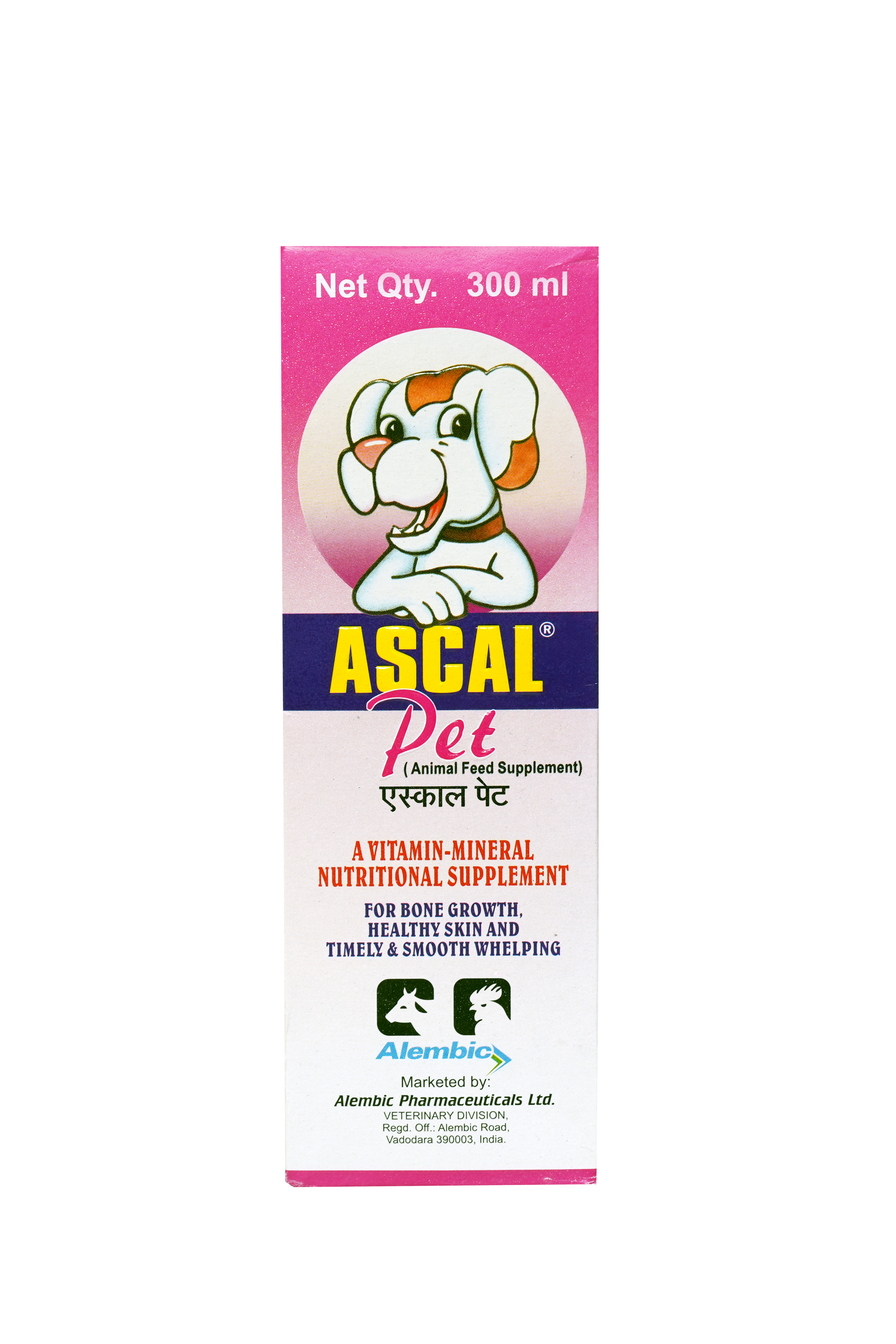ASCAL Pet Syrup ASCAL Pet Syrup is a calcium and mineral supplement for dogs and cats, formulated to support strong bones, healthy teeth, and overall skeletal development. It is especially useful during growth, pregnancy, lactation, and recovery phases, helping pets maintain optimal calcium levels. This palatable syrup aids in preventing calcium deficiency, weak bones, and poor growth, and supports joint and muscle health in pets of all ages. ASCAL Pet is manufactured by Alembic Pharmaceuticals, a trusted name in veterinary healthcare. Key Benefits: Supports bone and teeth strength Helps prevent calcium deficiency Useful during growth, pregnancy & lactation Aids in post-illness and fracture recovery Suitable for dogs and cats To be given orally as directed by a veterinarian. Disclaimer: ASCAL Pet is a nutritional supplement for dogs and cats. It is intended for supportive care only and not a substitute for veterinary advice or treatment. Please consult a qualified veterinarian before use. AVETMART supports, but does not replace, the veterinarian–pet owner relationship.