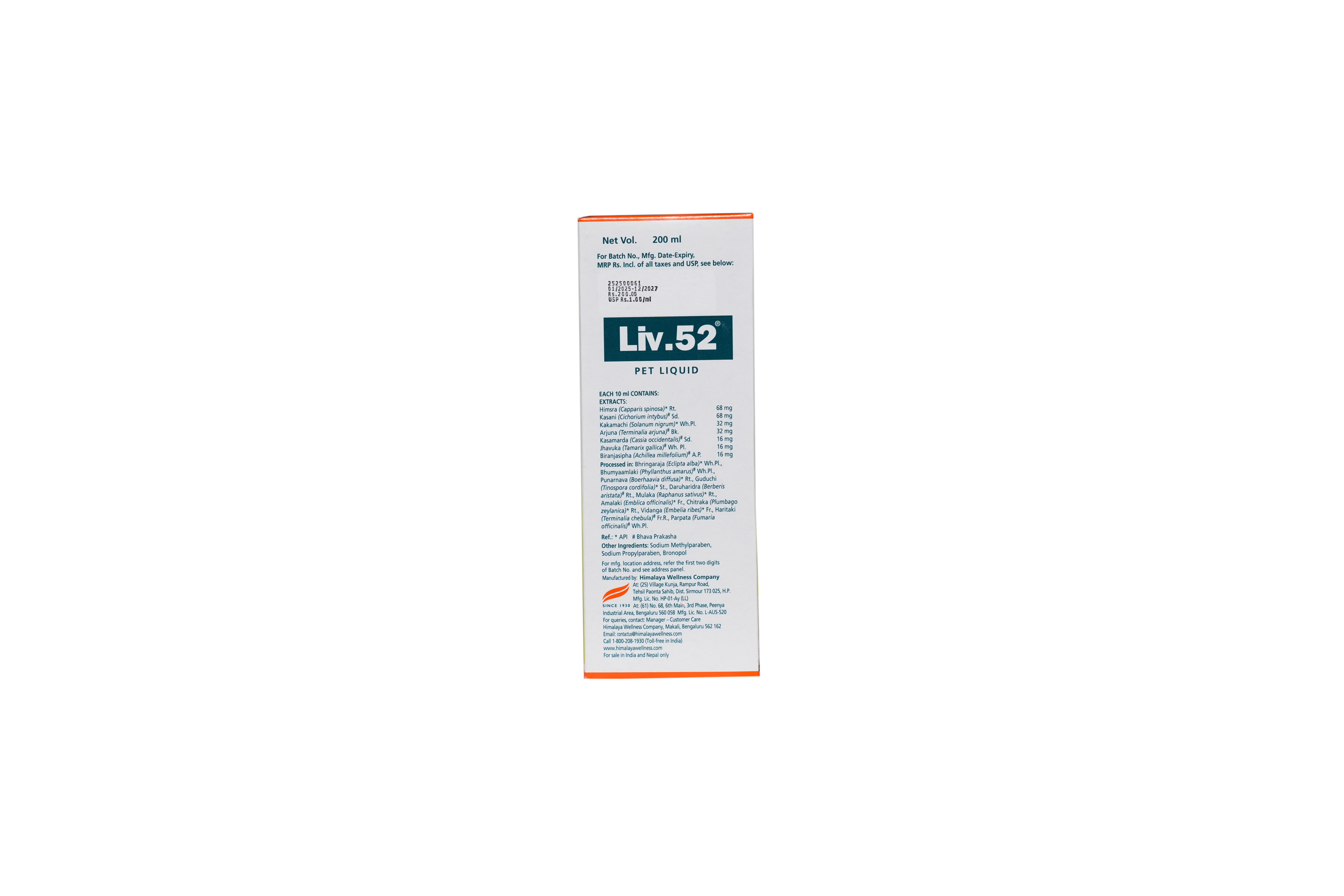Liv.52 PET Liquid – Liver Support for Dogs & Cats Liv.52 PET Liquid is a herbal liver supplement formulated to support healthy liver function in dogs and cats. Enriched with natural ingredients like Himsra and Kasani, it helps protect the liver from damage caused by toxins, drugs, and infections while supporting appetite, digestion, and overall vitality. It also acts as a growth promoter and metabolic stimulant, making it beneficial for young, stressed, or recovering pets. Key Highlights Liver Protectant Supports repair and regeneration of liver cells and helps maintain healthy liver function. Growth Promoter Helps improve appetite and nutrient utilization, supporting healthy growth. Metabolic Stimulant Enhances metabolic activity and supports digestion and energy levels. Key Benefits Supports liver health in hepatic dysfunction, jaundice, and toxicity Helps manage viral hepatitis, distemper, and parvovirus as supportive care Improves appetite during stress (boarding, relocation, illness) Useful alongside deworming and drug therapy Suitable for dogs and cats Indications Loss of appetite (anorexia) Liver damage and dysfunction Drug- or toxin-induced liver stress Ascites and metabolic imbalance Recommended Dosage (Or as directed by a veterinarian) Small Breed Puppies: 5–8 ml twice daily Large Breed Puppies: 10–15 mltwice daily Kittens: 3–5 ml daily Shake well before use. Store in a cool, dry place away from sunlight. Disclaimer This is a nutritional supplement and should be used under veterinary guidance. Not intended to replace prescribed medication.