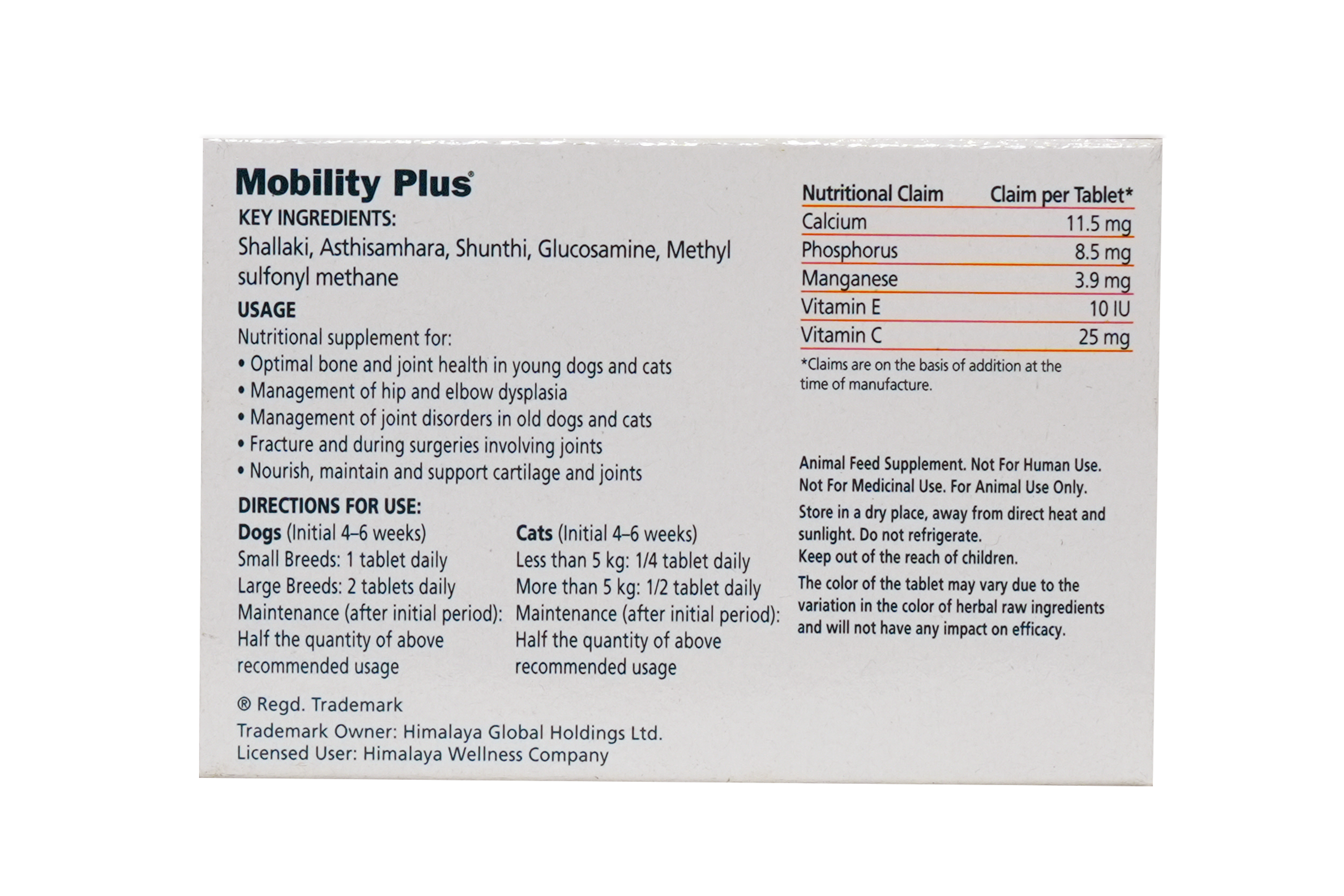 Mobility Plus Advance – Joint & Hip Supplement for Dogs & Cats Mobility Plus Advance is an advanced joint and hip support supplement designed to maintain healthy joints, bones, and mobility in pets of all ages. Its scientifically selected blend of Glucosamine, MSM, and herbal extracts helps reduce joint pain and inflammation, supports cartilage repair, and improves flexibility and movement. This supplement is especially beneficial for pets with osteoarthritis, hip or elbow dysplasia, and those recovering from joint injuries or surgery. Key Benefits Supports joint and hip health Helps reduce joint inflammation and pain Aids in cartilage repair and regeneration Useful in osteoarthritis and degenerative joint conditions Supports recovery after fractures and joint surgeries Suitable for dogs and cats Key Ingredients Glucosamine – Supports cartilage health and joint lubrication MSM (Methyl Sulfonyl Methane) – Helps reduce inflammation and pain Sunthi – Natural anti-inflammatory support Shallaki – Supports joint comfort and mobility Asthisamhara – Supports bone and joint strength Directions for Use (Or as directed by a veterinarian) Dogs Small Breeds: 1 tablet daily Large Breeds: 2 tablets daily Cats Below 5 kg: ¼ tablet daily Above 5 kg: ½ tablet daily Disclaimer This product is a nutritional supplement and should be used under veterinary guidance. Not intended to replace prescribed medication.