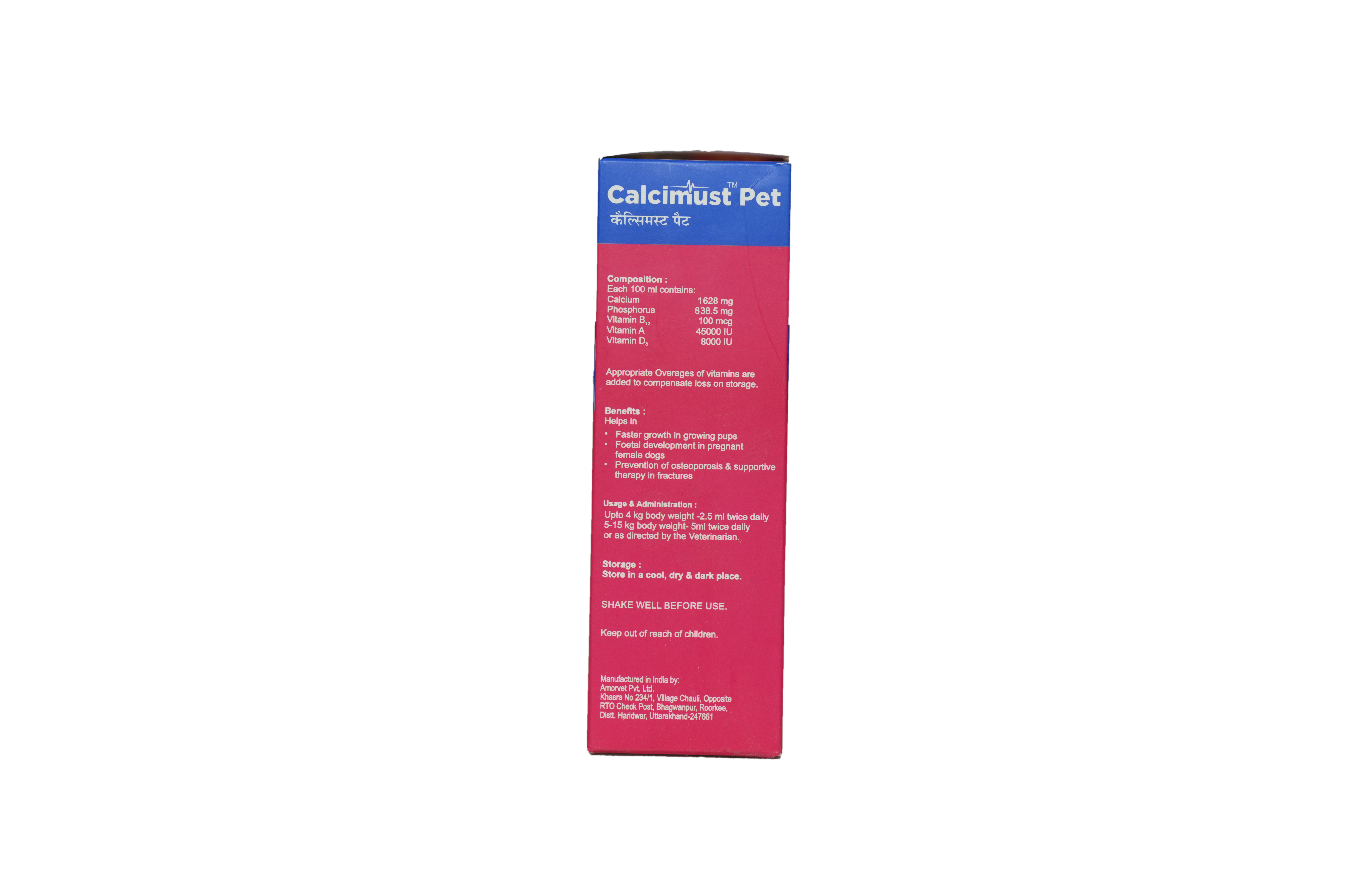 Calcimust Syrup – Calcium Supplement for Dogs & Cats Calcimust Syrup is a veterinary calcium supplement enriched with Vitamin A, Vitamin D3, and Vitamin B12, specially formulated to support strong bones, teeth, and overall skeletal health in pets. It helps prevent calcium and phosphorus deficiencies and is beneficial during growth, pregnancy, and recovery stages. This supplement is recommended for growing puppies and kittens to meet the increased demand for rapidly developing bones. In adult and senior pets, it supports bone strength and helps reduce the risk of fractures, osteoporosis, and related conditions. Calcimust Syrup is also useful during pregnancy and lactation, aiding proper foetal development and helping prevent hypocalcaemia (eclampsia). Key Benefits Supports healthy bone and teeth development Helps prevent rickets and osteomalacia Useful in growing, pregnant, and lactating pets Aids mineral balance during deficiency and recovery Directions for Use Use as directed by the veterinarian Can be given directly using a syringe or mixed with food Suitable For Dogs and Cats Disclaimer For veterinary use only. Use strictly as advised by a registered veterinarian.