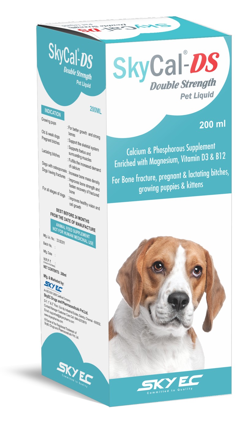 SkyCal-DS ®Double Strength Double Strength Calcium Supplement For Dogs & Cats Composition Each 20 ml contains Calcium : 800 mg, Phosphorus: 400 mg, Vitamin D3 : 9000 IU Vitamin B12: 45 mcg & Magnesium: 20mg. Indication For Growing Puppies, Pregnant and Lactating Dogs & Cats. Dogs with Fractured Bones, Rickets, Osteoporosis, Hip Dysplasia & Bone Surgeries. Unique Benefits Skycal-DS contains Double-Strength Calcium, Phosphorus & Vitamins which helps to reduce the convalescence period after fractures & surgery. Due to high demand for extra Calcium and Phosphorus, Skycal-DS can be used at any time during growth, pregnancy and lactation. Skycal-DS Contains Magnesium & Vitamin D3 which is essential for calcium absorption. Unlike other market supplements, there is no sediment formation in Skycal-DS. Dosage & Administration Small Breed dogs: 5ml twice daily & Large Breed dogs: 10ml twice daily
